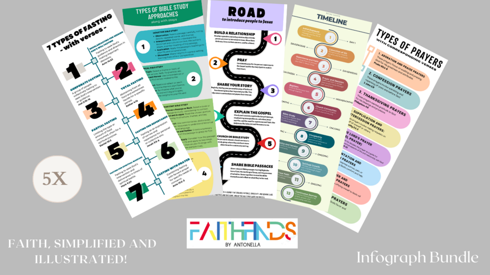 Are you ready to deepen your understanding of faith in an engaging and straightforward way? Look no further than our carefully curated bundle of 5 Christian-themed infographs, available in both PDF and PNG formats. These beautifully designed visuals offer a clear and captivating exploration of essential concepts, making learning about your faith a delightful experience.